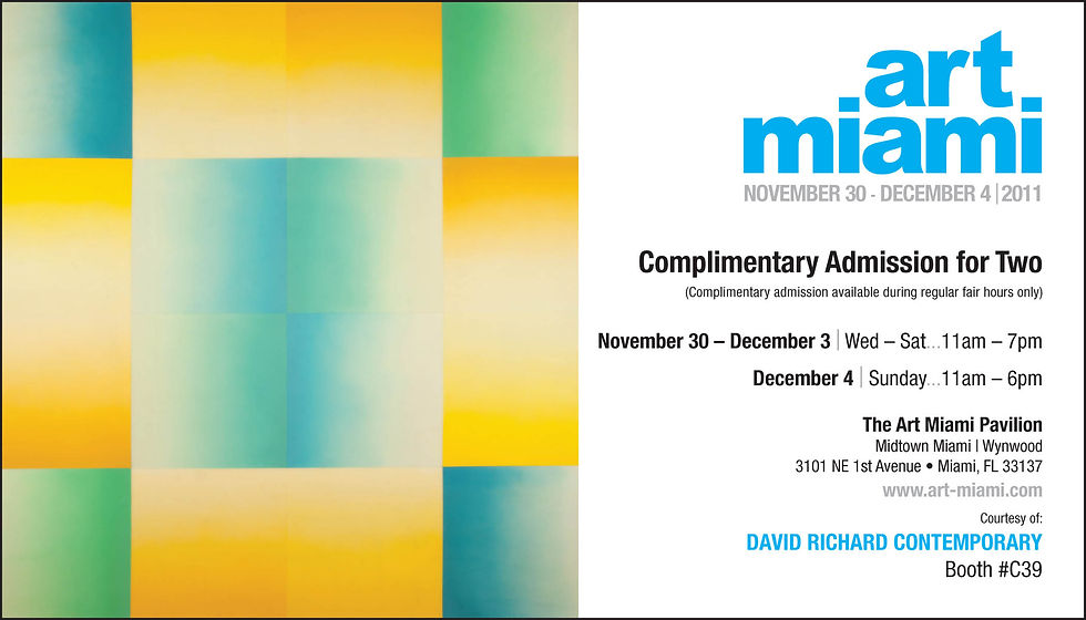 Art Miami November 30 - December 4, 2011 VIP Preview: Tuesday, November 29 5:30 p.m. - 7:00 p.m. Benefiting: Lotus House Women's Shelter Limited number of Complimentary VIP Passes available. Please contact us. The Art Miami Pavilion Midtown Miami | Wynwood 3101 NE 1st Avenue Miami, FL 33137 520-529-1108 Booth # C39 Featuring: Wall Batterton Judy Chicago Lilly Fenichel Beverly Fishman Maxwell Hendler Charles Hinman Ward Jackson Roland Reiss Adi Da Samraj Julian Stanczak Robert Swain Artwork to right: Adi Da Samraj, Eurydice One: The Illusory Fall of The Bicycle Into The Sub-Atomic Parallel Worlds of Primary Color and Point of View – Part Three: The Abstract Narrative In Geome and Linead (Second Stage) – V, 2 from Linead One, 2007, 2010 , Lacquer on aluminum, 72" x 72" Roland Reiss, Apertures - Eyesights, 2000, Acrylic on canvas, 59 x 78"
